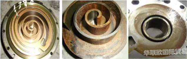 解剖表現(xiàn):機(jī)構(gòu)表面輕則鍍銅,重則生銹。(渦盤間隙和滾動活塞與缸蓋、氣缸內(nèi)壁間隙約10~20um,生銹、鍍銅導(dǎo)致間隙減小,摩擦增大。)