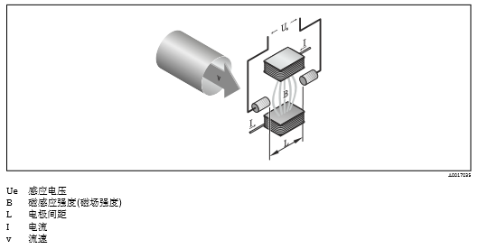 在電磁測(cè)量原理中,流動(dòng)的介質(zhì)相當(dāng)于運(yùn)動(dòng)的導(dǎo)體。感應(yīng)電壓(Ue)與介質(zhì)流速(v)成比例關(guān)系,通 過兩個(gè)測(cè)量電極加載在放大器上。基于管道橫截面積(A)計(jì)算體積流量(Q)。極性交替變換的開關(guān) 直流電產(chǎn)生直流(DC)磁場(chǎng)。
